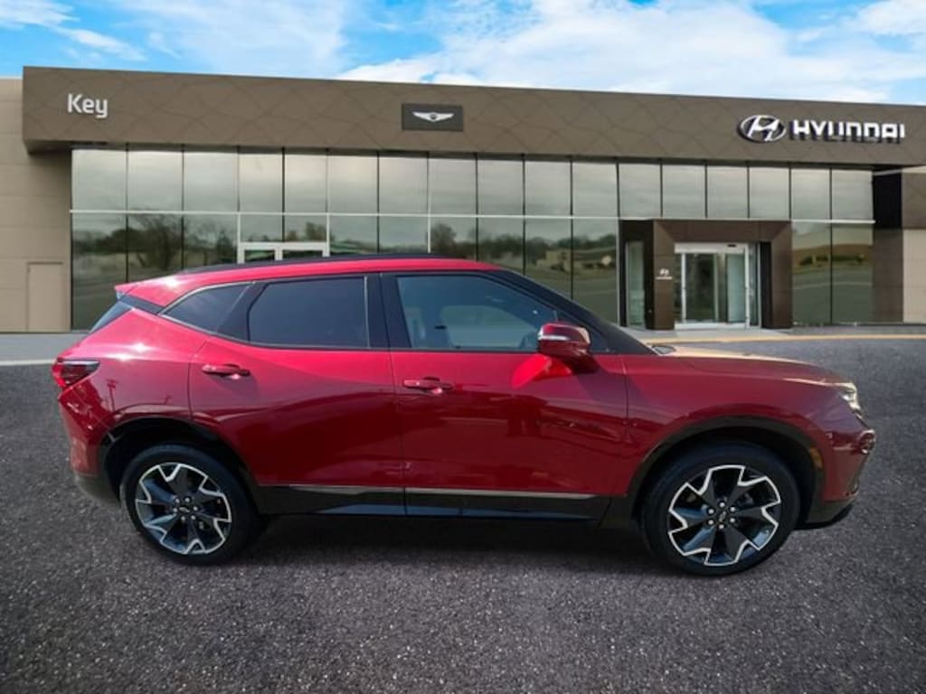AWD, 3.49 Final Drive Axle Ratio, 4-Wheel Disc Brakes, 6 Speakers, 6-Speaker Audio System Feature, 6-Way Power Front Passenger Seat Adjuster, ABS brakes, Air Conditioning, Alloy wheels, AM/FM radio: SiriusXM with 360L, Apple CarPlay/Android Auto, Auto High-beam Headlights, Auto-dimming door mirrors, Auto-dimming Rear-View mirror, Automatic temperature control, Brake assist, Bumpers: body-color, Child-Seat-Sensing Airbag, Compass, Delay-off headlights, Driver door bin, Driver vanity mirror, Dual front impact airbags, Dual front side impact airbags, Electronic Stability Control, Emergency communication system: OnStar and Chevrolet connected services capable, Enhanced Convenience Package, Exterior Parking Camera Rear, Four wheel independent suspension, Front anti-roll bar, Front Bucket Seats, Front Center Armrest, Front dual zone A/C, Front reading lights, Fully automatic headlights, Garage door transmitter, Heated door mirrors, Heated Driver & Front Passenger Seats, Heated front seats, Heated Rear Outboard Seating Positions, Heated Steering Wheel, Heated steering wheel, High-Intensity Discharge Headlights, Illuminated entry, Knee airbag, Leather Shift Knob, Low tire pressure warning, Memory Settings For Driver Seat & Exterior Mirrors, Navigation System, Not Equipped w/Driver & Fr Passenger Heated Seats, Not Equipped w/Heated Rear Outboard Seats, Not Equipped w/Heated Steering Wheel, Not Equipped w/Rear Park Assist, Occupant sensing airbag, Outside temperature display, Overhead airbag, Overhead console, Panic alarm, Passenger door bin, Passenger vanity mirror, Perforated Leather-Appointed Seat Trim, Power door mirrors, Power driver seat, Power Liftgate, Power Panoramic Tilt-Sliding Sunroof, Power passenger seat, Power steering, Power Tilt & Telescoping Steering Column, Power windows, Preferred Equipment Group 1RS, Radio data system, Radio: Chevrolet Infotainment 3 Plus System, Rear anti-roll bar, Rear reading lights, Rear seat center armrest, Rear window defroster, Rear window wiper, Remote keyless entry, Ride & Handling Suspension, Security system, SiriusXM w/360L, Speed control, Speed-sensing steering, Split folding rear seat, Spoiler, Steering wheel mounted audio controls, Tachometer, Telescoping steering wheel, Tilt steering wheel, Traction control, Trip computer, Turn signal indicator mirrors, Variably intermittent wipers, Ventilated Driver & Front Passenger Seats, Voltmeter, Wheels: 20 Dark Android Machined-Face Aluminum, AWD. Cherry Red Tintcoat 2022 Chevrolet Blazer RS AWD 9-Speed Automatic with Overdrive 3.6L V6 SIDI